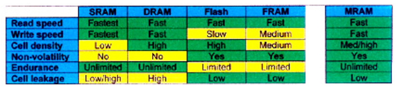 內(nèi)存選項(xiàng)的比較與其他內(nèi)存技術(shù)選項(xiàng)相比,MRAM具有明顯的優(yōu)勢(下表1)。