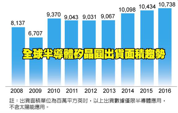 依據(jù)國際半導(dǎo)體產(chǎn)業(yè)協(xié)會(SEMI)旗下硅晶圓制造者部門SMG(Silicon Manufacturers Group)公布的年終硅晶圓產(chǎn)業(yè)分析報(bào)告顯示,2016年全球半導(dǎo)體硅晶圓出貨總面積達(dá)10,738百萬平方英吋,年成長率達(dá)3%,連續(xù)3年創(chuàng)下出貨量歷史記錄新高。