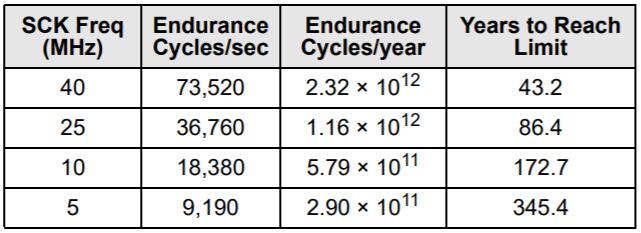 FeRAM存儲器具有讀取和還原機制。因此,對于存儲陣列的每次訪問(讀取或寫入),將按行施加耐久周期。 FRAM體系結構基于每個64位的16K行的行和列的陣列。整個行在內部訪問一次,無論是讀取還是寫入一個字節(jié)或全部八個字節(jié)。在耐久性計算中,該行中的每個字節(jié)僅被計數一次。下圖顯示了一個64字節(jié)重復循環(huán)的耐久性計算,該循環(huán)包括一個操作碼,一個起始地址和一個順序的64字節(jié)數據流。這將導致每個字節(jié)在整個循環(huán)中經歷一個持久周期。即使在40 MHz時鐘速率下,FRAM的讀寫持久性實際上也是無限的。