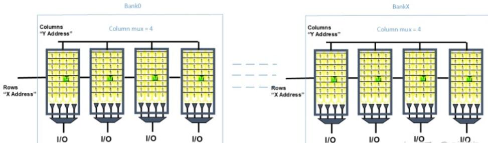 這些SRAM cell集合成如下圖的多個(gè)bank的memory block,每個(gè)bank有bank address使能;在一個(gè)bank內(nèi)Row address選擇一個(gè)完整的wordline,Column address選擇某組IO bitlines。