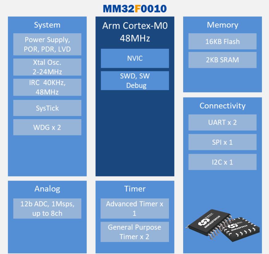 MM32F0010在性能、功耗和外設配置方面具有顯著的特點,其中包括: