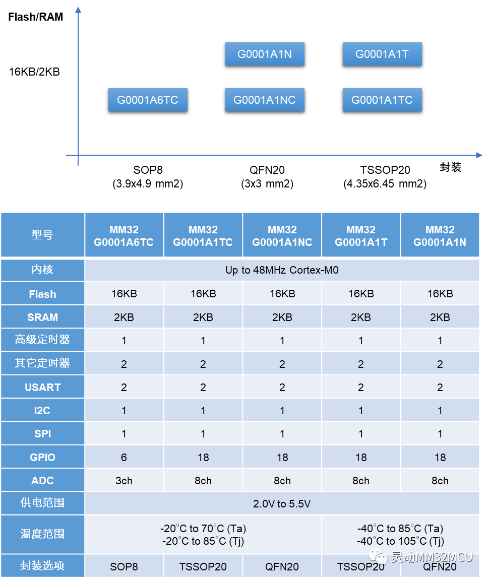 MM32G0001提供TSSOP20,QFN20和SOP8三種封裝,提供-40~85℃工業(yè)級和-20~70℃消費級環(huán)境溫度選項,共推出5款型號可供選擇。支持為特定客戶和應(yīng)用定制DFN、DIP和SOP等常見的小引腳封裝。