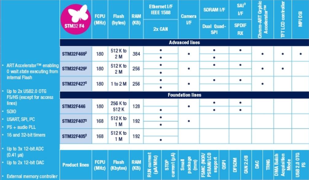 STM32F407/417–168MHzCPU/210DMIPS,高達1MB的閃存,添加了以太網(wǎng)MAC和攝像頭接口