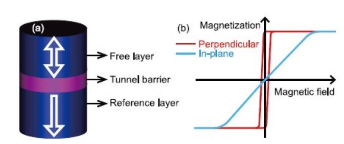 圖1(a)垂直磁各向異性的磁隧道結(jié);(b)沿面內(nèi)和垂直方向的磁化曲線,證明易磁化軸沿垂直方向。