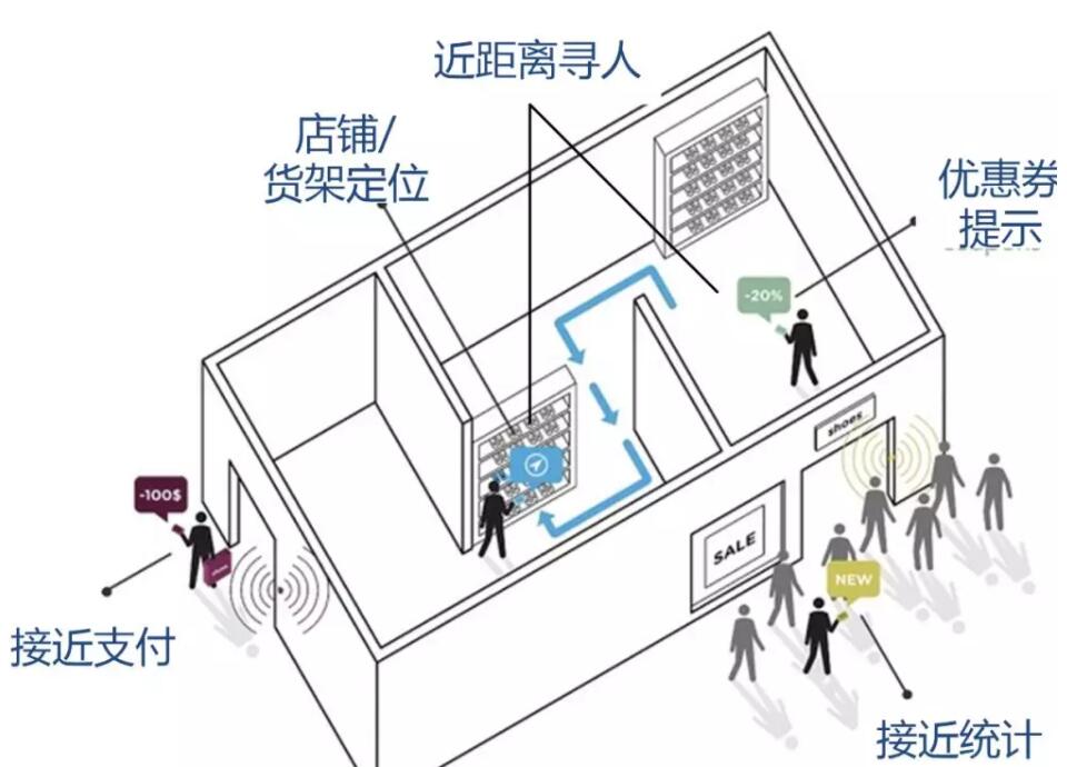 基于位置的服務(LBS)成為互聯(lián)網(wǎng)巨頭在實現(xiàn)O2O的重要手段。BLE的廣播信號是每一臺手機都可以收到的信號,一個顧客在接近商鋪時就可以收到商家推廣廣告。在微信中的搖一搖“周邊”中,主要采用這種技術。