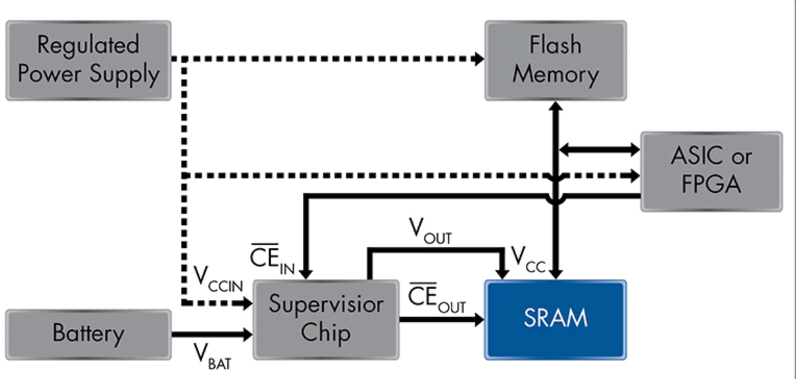 下圖所示的示意圖中顯示了一種常用配置,該圖顯示了MoBL®SRAM如何在具有Supervisory芯片的電池供電配置中使用。