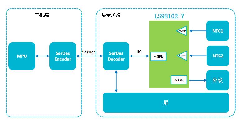 現(xiàn)場(chǎng)可重構(gòu)IC LS98102/-V采用QFN14封裝(車(chē)規(guī)級(jí)),供電范圍2.3V~5.5V,靜態(tài)電流100nA,12個(gè)可任意配置GPIO。該器件具有監(jiān)控2路NTC的溫度,溫度異常時(shí)發(fā)出中斷給SerDes端,主機(jī)控制發(fā)出關(guān)屏等指令信息擴(kuò)展GPIO口,用于控制顯示屏端其他外設(shè)。